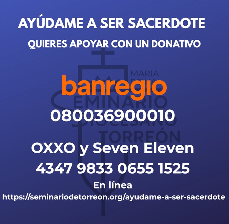 Puedes hacerla a nombre de: El Seminario de Santa María Reina de Torreón, A.R. a la cuenta BANREGIO: 0580-6080-0369-0001-08